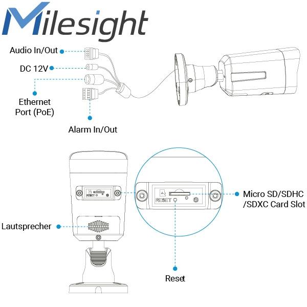 LAN (RJ45), Kartenslot (microSD) bis 1 GB, 1 x Alarm In/Out, 1 x Audio In/Out.