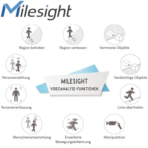 Erweiterte Bewegungserkennung, Linie übertreten, Region betreten, Region verlassen, Manipulationserkennung, Herumlungern-Erkennung, Personenerfassung, Personenzählung, vermisste Objekte, verdächtige Objekte, Personen/Fahrzeug-Unterscheidung.